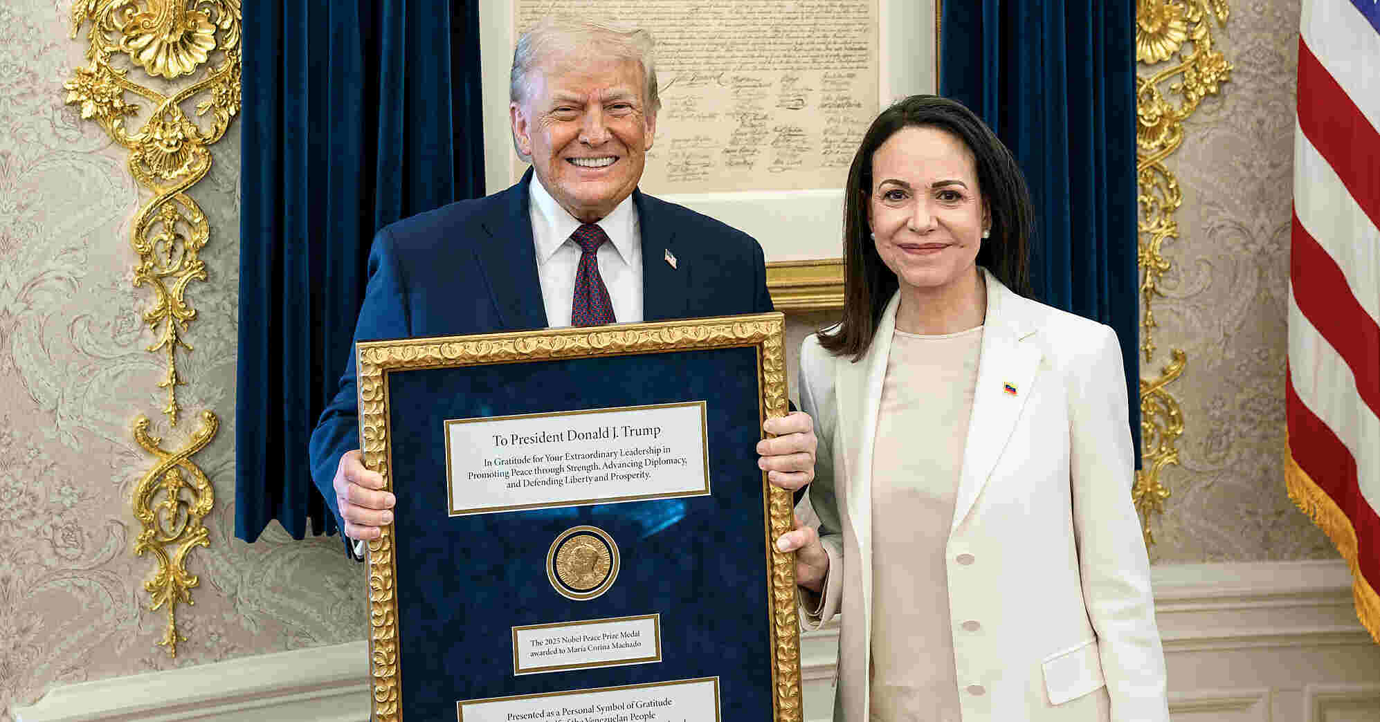 Президент США Дональд Трамп назвав "жестом взаємоповаги" те, що лідерка опозиції Венесуели та лауреатка Нобелівської премії миру Марія Коріна Мачадо передала йому свою нагороду. Трамп у своїй соцмережі Truth Social зазначив, що для нього "було великою честю" зустрітися з Мачадо. Американський лідер назвав Мачадо "чудовою жінкою, яка пережила так багато". "Марія подарувала мені свою Нобелівську премію миру за роботу, яку я зробив. Такий чудовий жест взаємної поваги. Дякую, Маріє!", – заявив Трамп. Мачадо раніше заявила, що віддала Трампу свою нагороду. Водночас Норвезький Нобелівський інститут заявив, що премію не можна передавати.